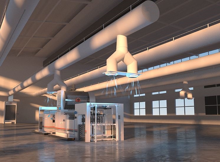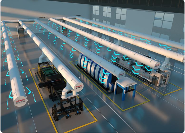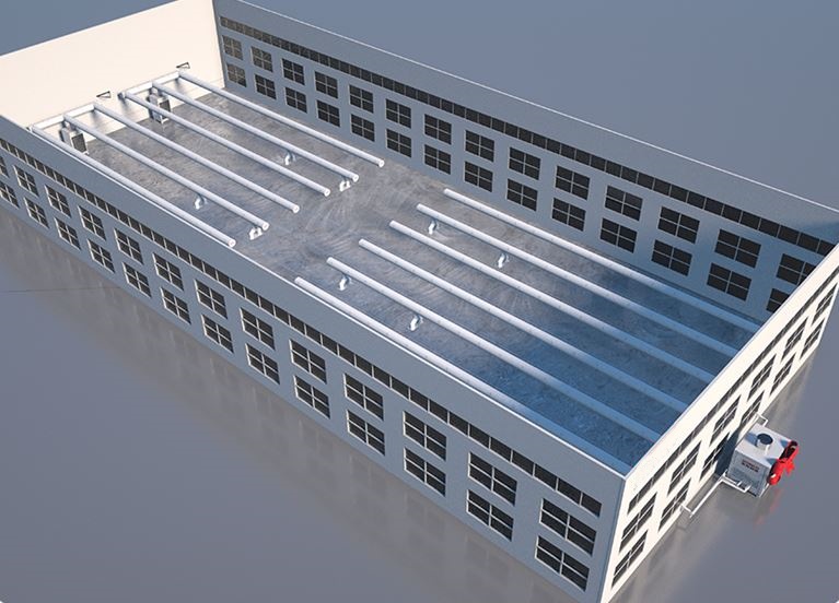 A/C system delivers air up to 100 meters with a 20,000 cubic meter per hour airflow, ensuring uniform temperature and a comfortable working environment, enhancing productivity and well-being in large areas