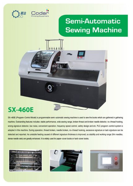 SX-460E (Program-Control Model) is programmable semi-automatic book sewing machine is used to sew the books which are gathered in gathering machine. Outstanding features includes: stable performance, wide sewing range, broken thread and broken needle detector, no-thread hooking, wrong signature detector, low noise, convenient operation, frequency speed control, safety design and etc. PLC program-control system is adopted in this machine. During operation, thread broken, needle broken, no-thread hooking, excessive signature or lack signature can be detected and reported. As unstable feeding caused of different signature thickness is improved, so stability and working range (thin needles, dense needle sets) are greatly enhanced. It is widely used for paper-cover books or hard-cover books.